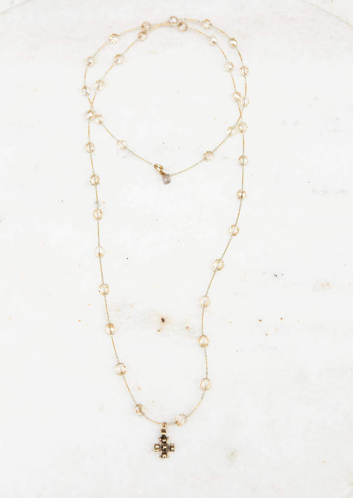 Twenty-six faceted citrine orbs spaced 2" apart by tiny clear and gold beads, with a 1.75" ornate flat gold cross pendant.
