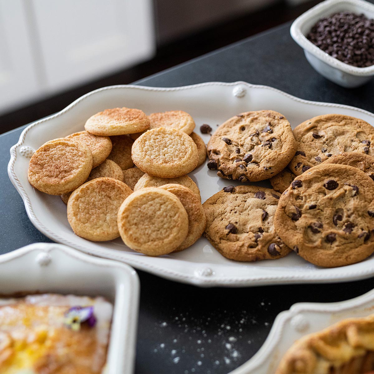 From our Berry & Thread Collection - Rimmed with a simple thread and adorned with a sprinkling of berries, this iconic dinnerware collection embraces the historic motifs of our Bohemian glassware. This 16 in platter, with a subtly scalloped edge is perfect for serving a few, or a feast and goes seamlessly from oven to table.