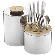 A 24-piece stainless steel flatware set in the Essentiel design contains dining essentials for 6 people and includes 6 dinner spoons, 6 dinner forks, 6 dinner knives, and 6 dessert spoons.The decorative mirror polished stainless steel cylinder case with a white oak wood interior disk stores the cutlery. Please note that the case and flatware is packaged separately to prevent scratching during shipment.