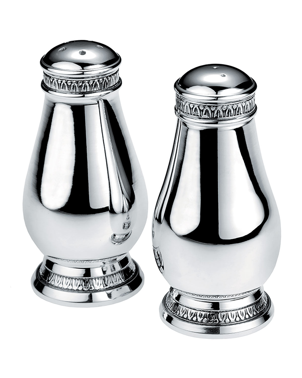 Silver-plated salt and pepper shakers in the Malmaison pattern.
