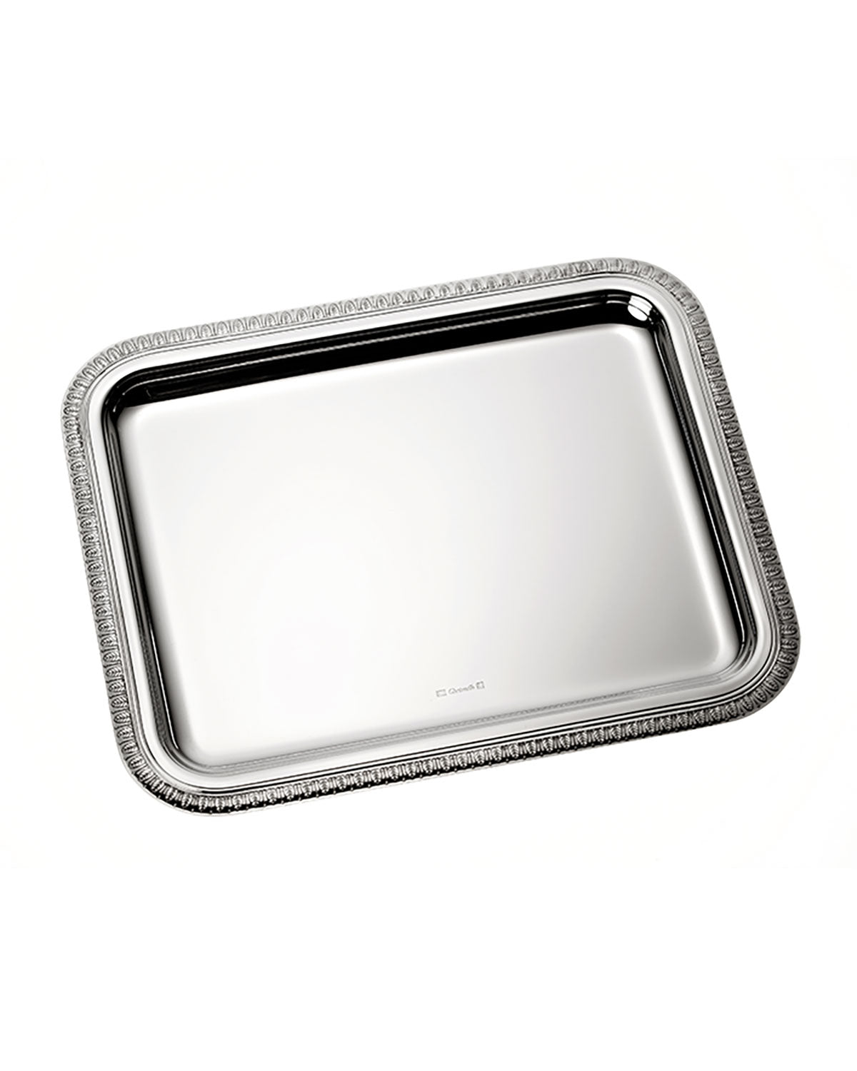 This small silver plated rectangular tray in the Malmaison pattern can be used for presentation or serving. One of Christofle's most historic patterns, Malmaison typifies the Empire style, with its frieze of delicate palm and lotus leaves and symmetrical design. The name is a nod to the Chateau de la Malmaison, a favored Parisian residence of Napoleon Bonaparte and Empress Josephine.