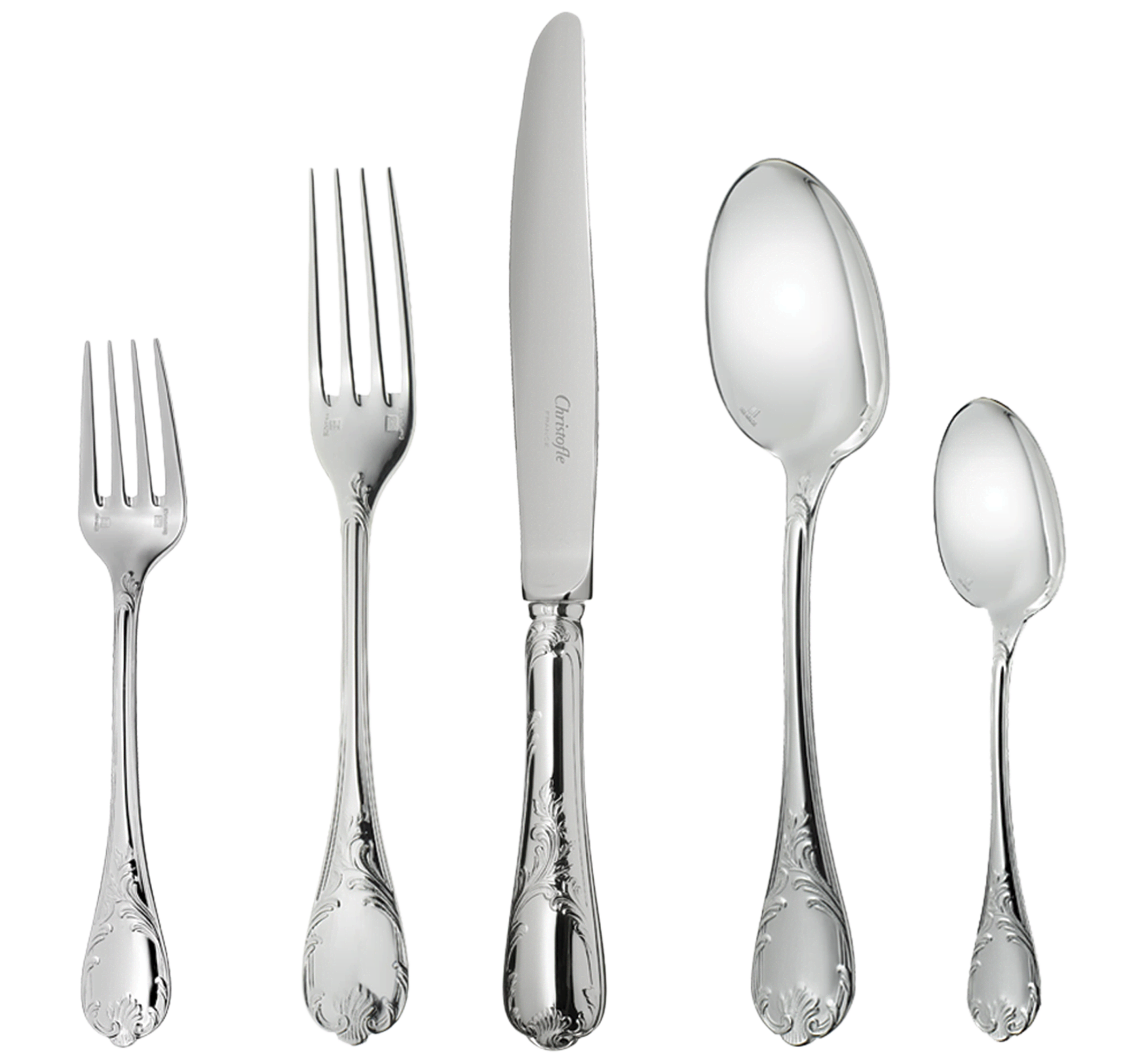 This 5-piece Marly silver plated flatware set has all the dining essentials for one including a standard tablespoon, dinner fork, dinner knife, salad fork and teaspoon. Marly, named after a no-longer-standing pleasure palace built by Louis XIV outside Paris, has been one of the most detailed and ornate patterns in the Christofle’s catalog since it was created in 1897. The fine chasing is an exquisite example of Rocaille with its asymmetrical crawling plant and shell motifs.