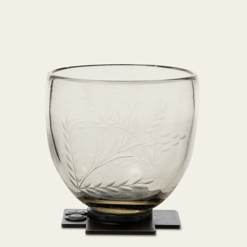 Mouth blown and etched goblet with iron cross base. . . refreshments, condiments, or candlelight . . . timeless