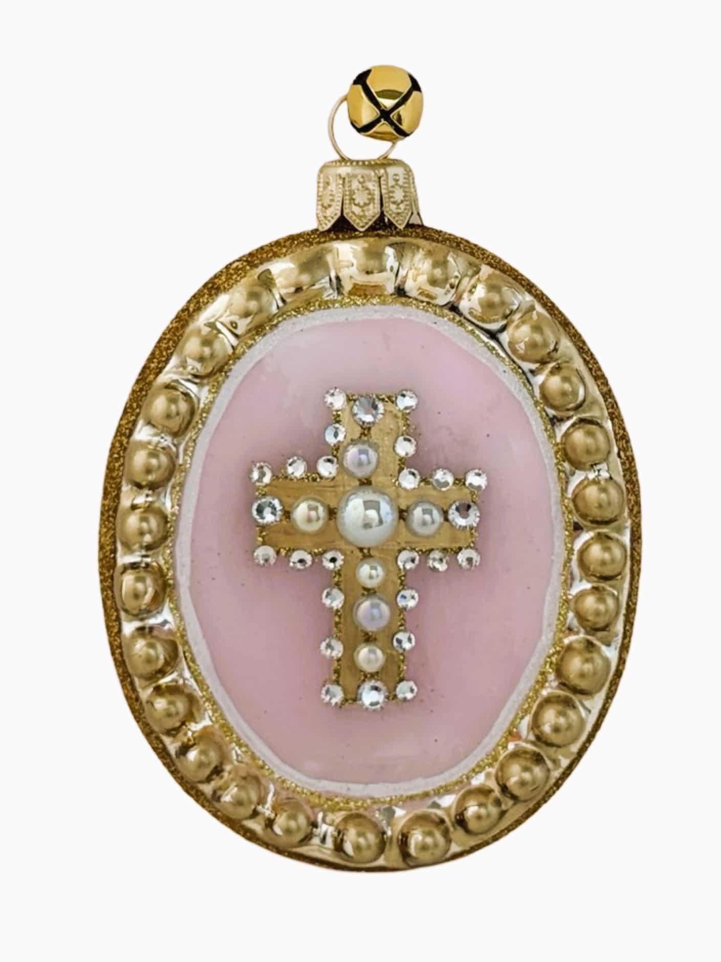 - Limited Edition Hand Painted Light Blue or Pink and Gold Glitter Cross Ornament Trimmed with Czech Crystals and Costume Pearls