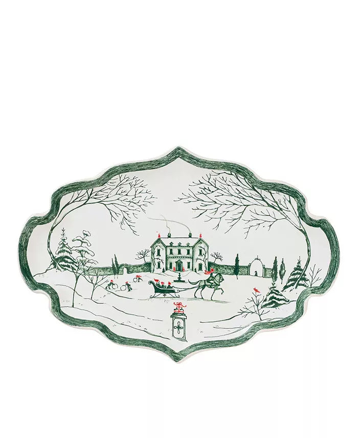 The Country Estate is covered in snow and illustrated in festive evergreen upon a crisp white backdrop with joyful winter pursuits like horse-drawn sleigh rides and building snowmen. Extra special details include the stunning scalloped rim and merry little pops of crimson accents. Perfect for displaying appetizers, sweets, trinkets or holiday cards all season long. Mrs. Claus loves it as a beautiful resting place for her spectacles, after a long night by the fire checking her lists and sipping sherry.