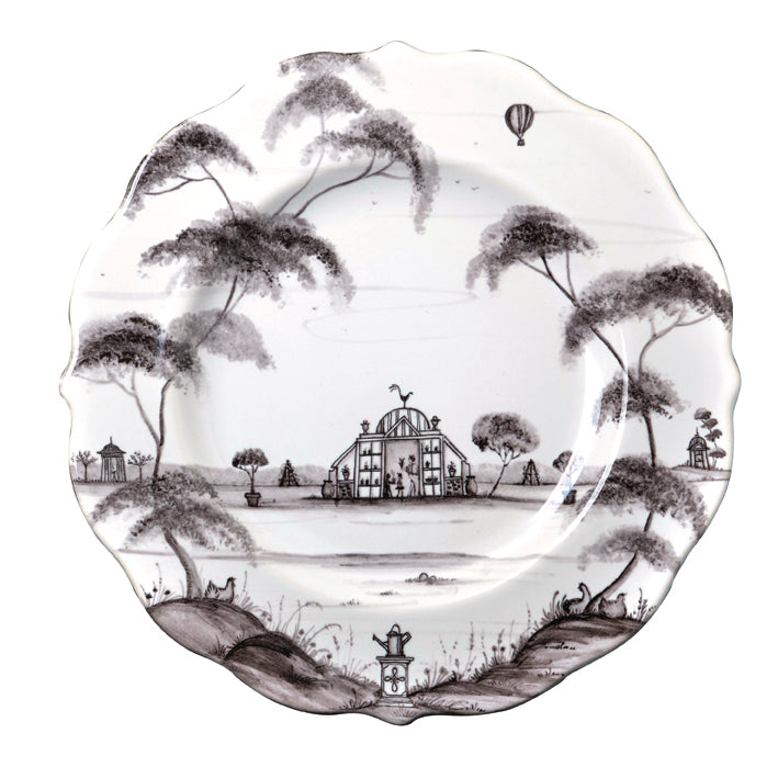 From our Country Estate Collection- the Conservatory is a serene place of growth and nurturing, reminding us to spend time with loved ones over al fresco summertime lunches. Our scalloped plate pairs superbly with long conversations and perfumed salads plucked from the herb garden. Or for a solitary respite, spend an afternoon penning sonnets in the Reading Pavilion with a slice of spiced chocolate cake. Featuring: Conservatory, Reading Pavilion, Hen House, and Balloon