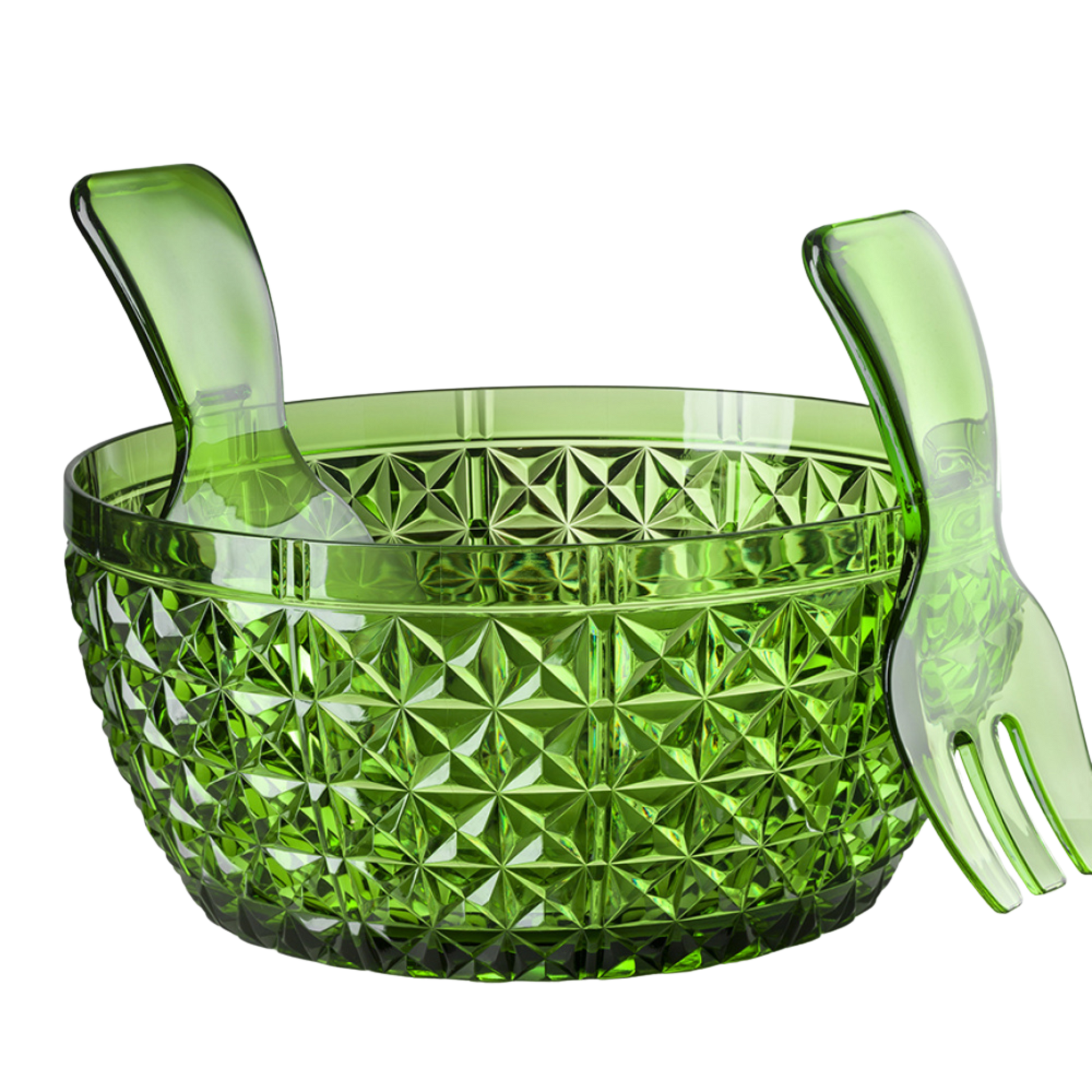The acrylic Churchills bowls come in two sizes: salad/serving or snack/cereal. The large salads bowl comes with servers to distribute to the individual snack bowls. We love this cute duo.