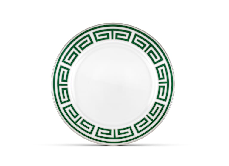 The set of flat plates is characterised by fine porcelain embellished with precious hand-painted platinum thread and rigorous emerald green decoration. The refined Impero style blends with geometric lines and together, they create a versatile and original design, which can be combined with the set of soup and dessert plates of the same collection or contrast with other shapes and colour variants of the Ginori 1735 collections.