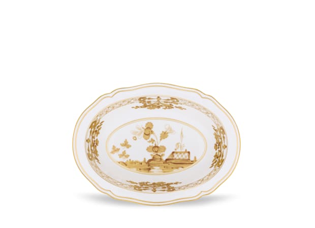 Oval bowl with Aurum white decoration and gold threading. Oriente Italiano Collection.