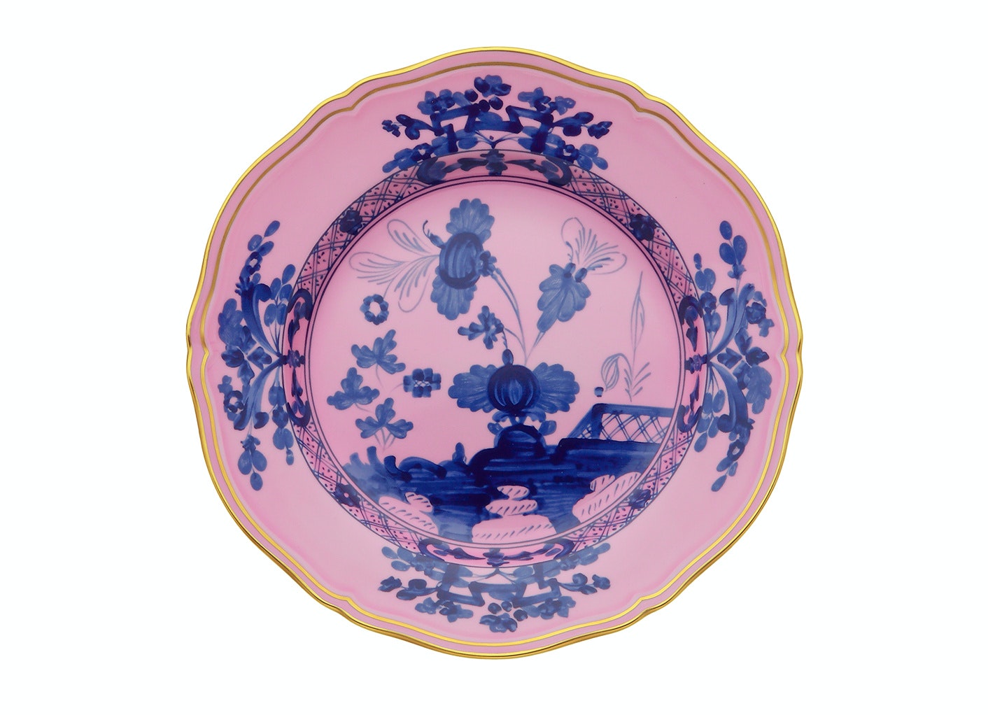The Oriente Italiano Azalea Flat Dinner Plate is made of high-quality porcelain, handcrafted with vibrant colors. This plate is perfect for any occasion.