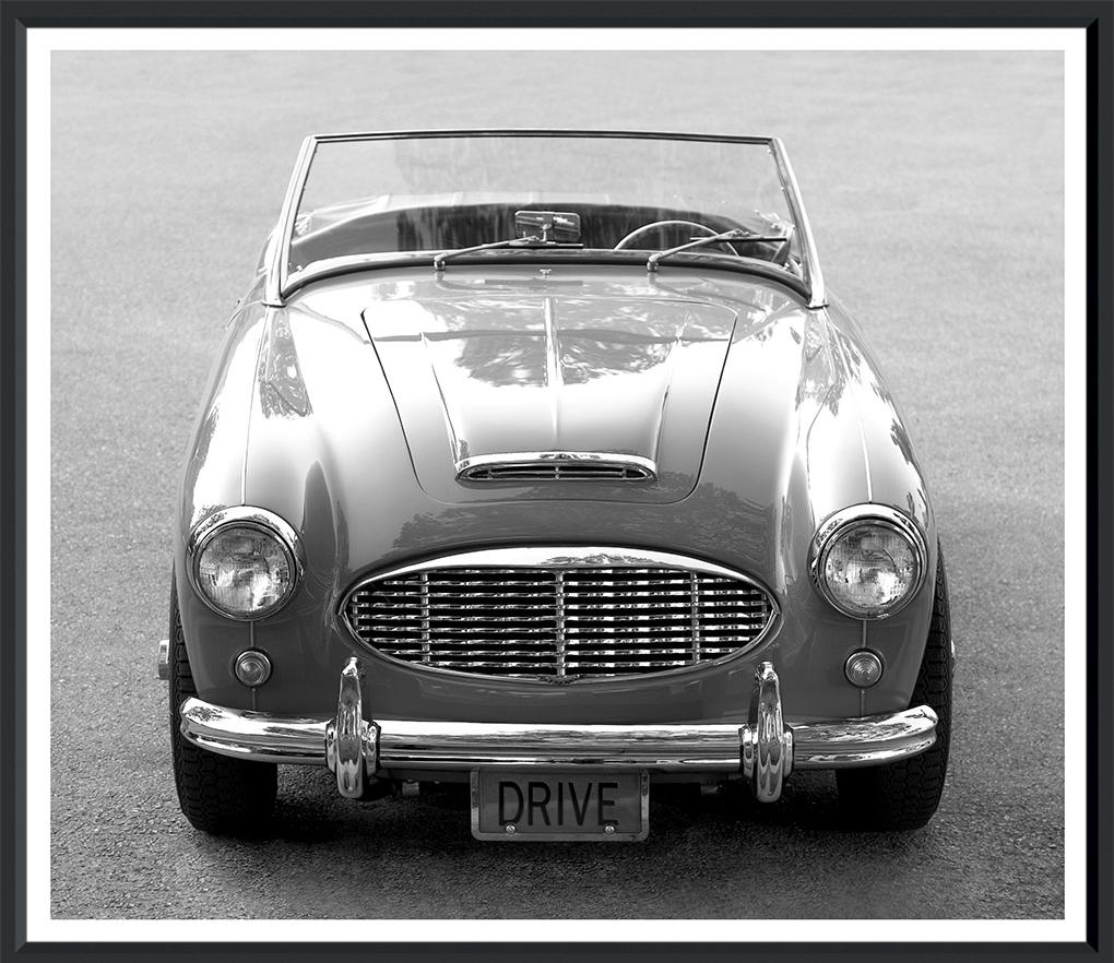 A head-on view of a classic 1960s Austin Healey 3000, with its signature round grille, chrome bumper plate, and 124-horsepower engine. The sporty convertible has a beloved status and is a sought-after British collectible, given the cars were only manufactured for around eight years, from the late 1950s through to 1968. The photograph is a simple, sleek, yet charming portrait of the timeless allure of motorcars—polished to perfection and proudly gleaming in the light.