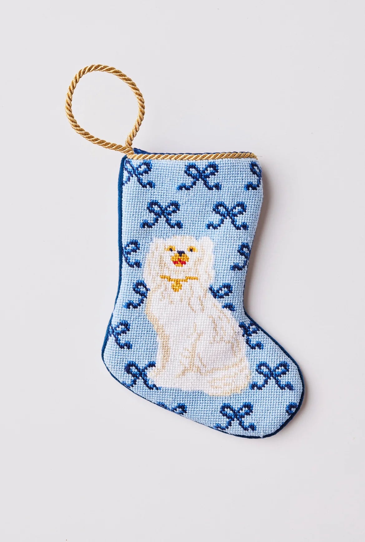Hand-stitched needlepoint heirloom stockings with cotton threads and velvet backing.
