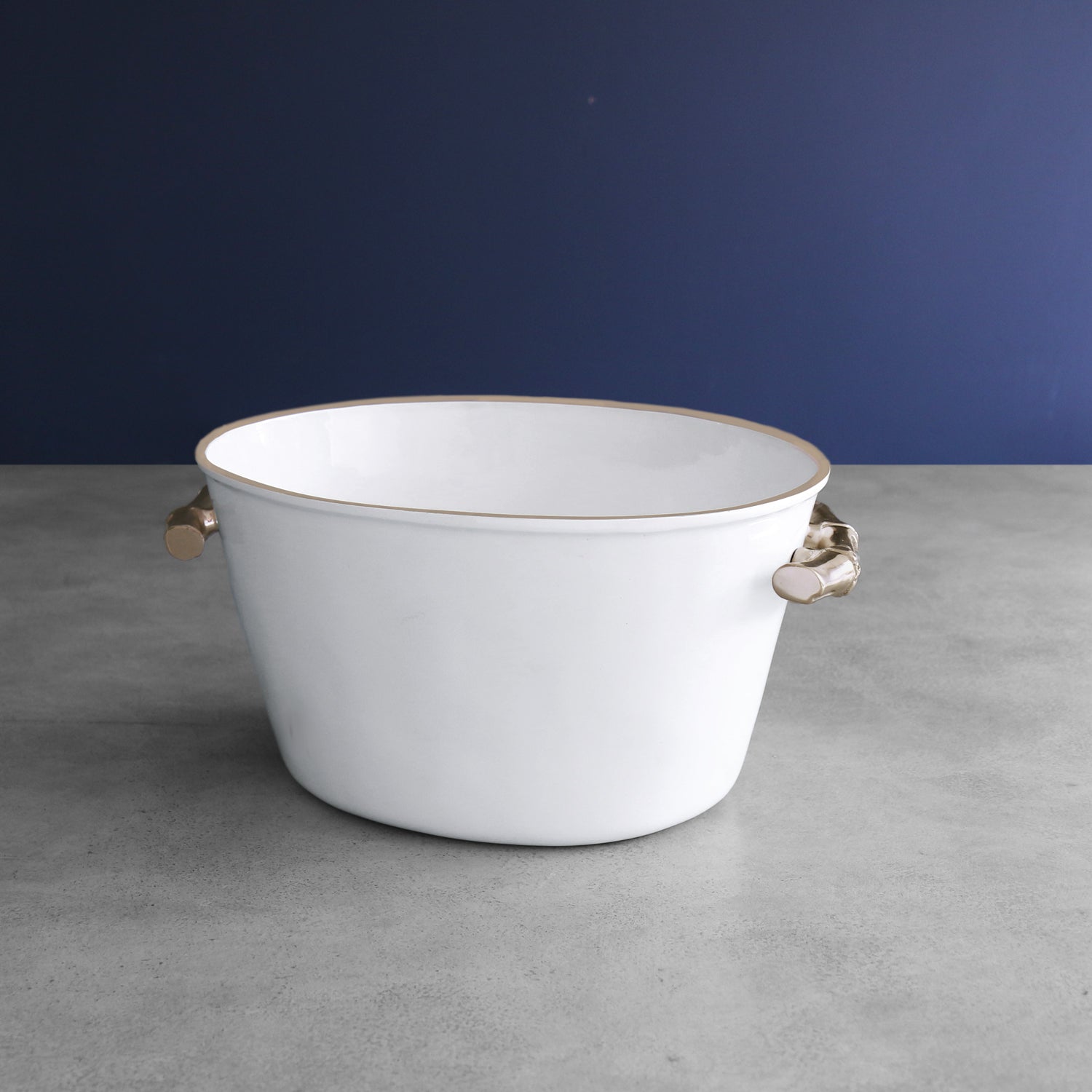 Timeless bamboo and an on-trend color palette of white and gold makes for an irresistible combination. You'll find it all in the Beatriz Ball THANNI Bamboo Large Oval Ice Bucket (White and Gold). A great expression of style, the handsome piece will take pride of place on any table or bar. With bamboo inspired gold-tone handles against a white enameled surface, our generously proportioned ice bucket allows you to serve icy-cold bottles in a most attractive serving piece. A natural with other Beatriz Ball Bamboo designs. Made in a proprietary process, you will not believe that the finishes are so sturdy that they can go even in commercial dishwashers! An original Beatriz Ball design, sustainably handmade of a top quality, FDA safe, easy-care, oven and freezer friendly aluminum alloy.