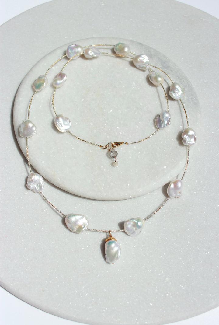 Thirty baroque pearls spaced by 2" of tiny clear and gold beads, with a capped pearl pendant.