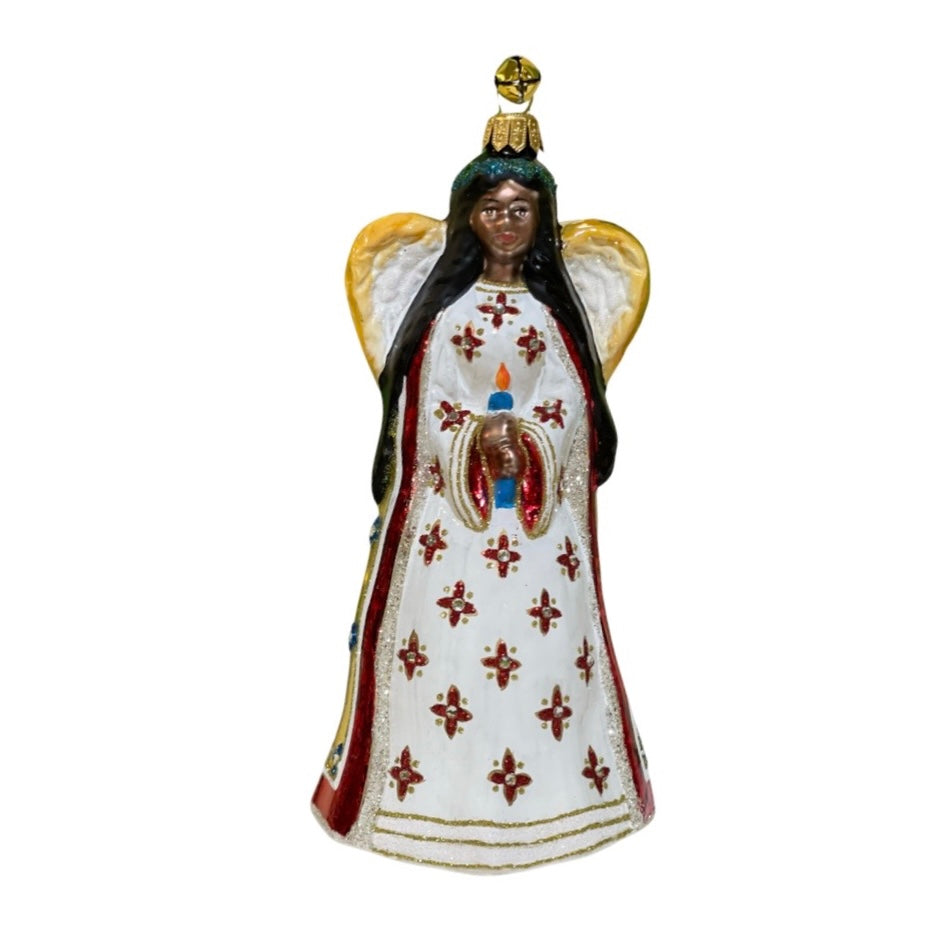 - Special Delicately Hand Painted Red, White and Gold Patterned Dress Angel Ornament Holding a Candle