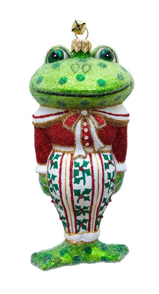 - Special Hand Painted Whimsical Holiday Frog Dressed in Holly Berry Leaf Stiped Pants and Red Glitter Jacket