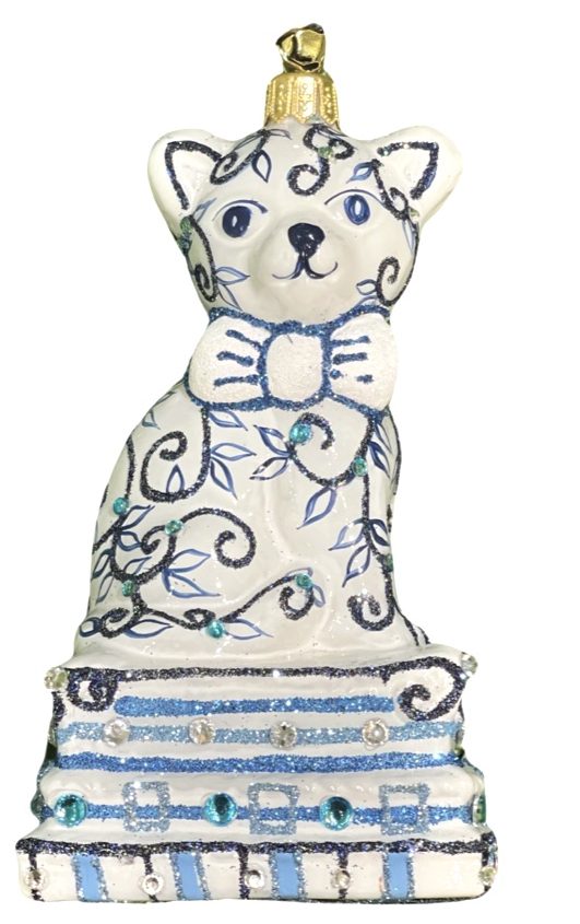 - Unique Whimsical Delft Blue and White Ceramic Style Patterned Cat Christmas Tree Ornament