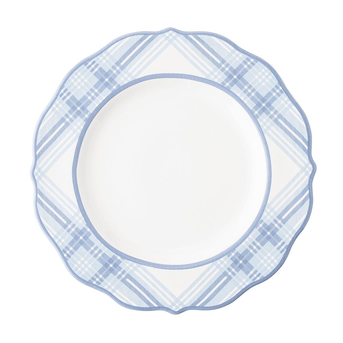 We’ve taken traditional tartan and given it a modern twist in fresh hues of chambray blue with a scalloped rim for a dash of understated frill. This dinner plate moves seamlessly from casual to formal occasions and was designed to complement our other blue and white collections.