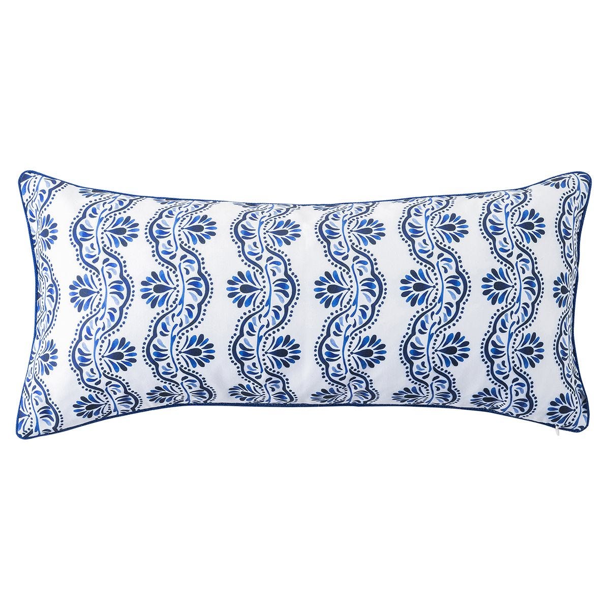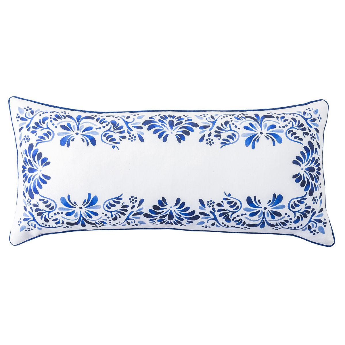 Rimmed in a beautiful cobalt border with motifs from our Iberian Journey dinnerware pieces, this lumbar pillow would look lovely nestled on a living room couch or as a finishing touch to a master bedroom. Stuffed with 10% down and 90% feather fill.