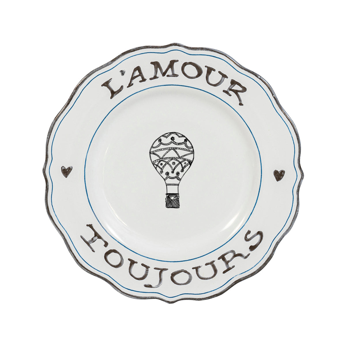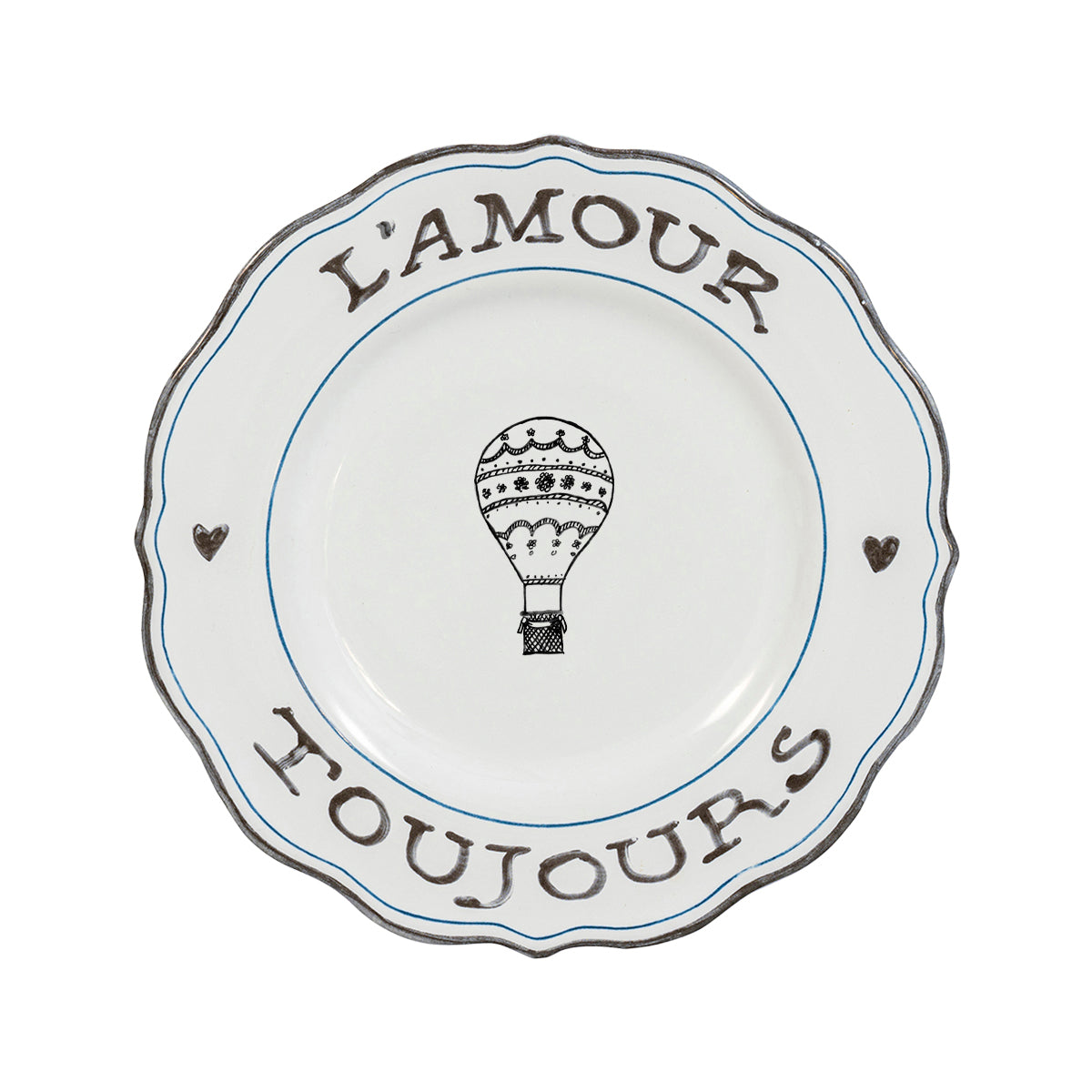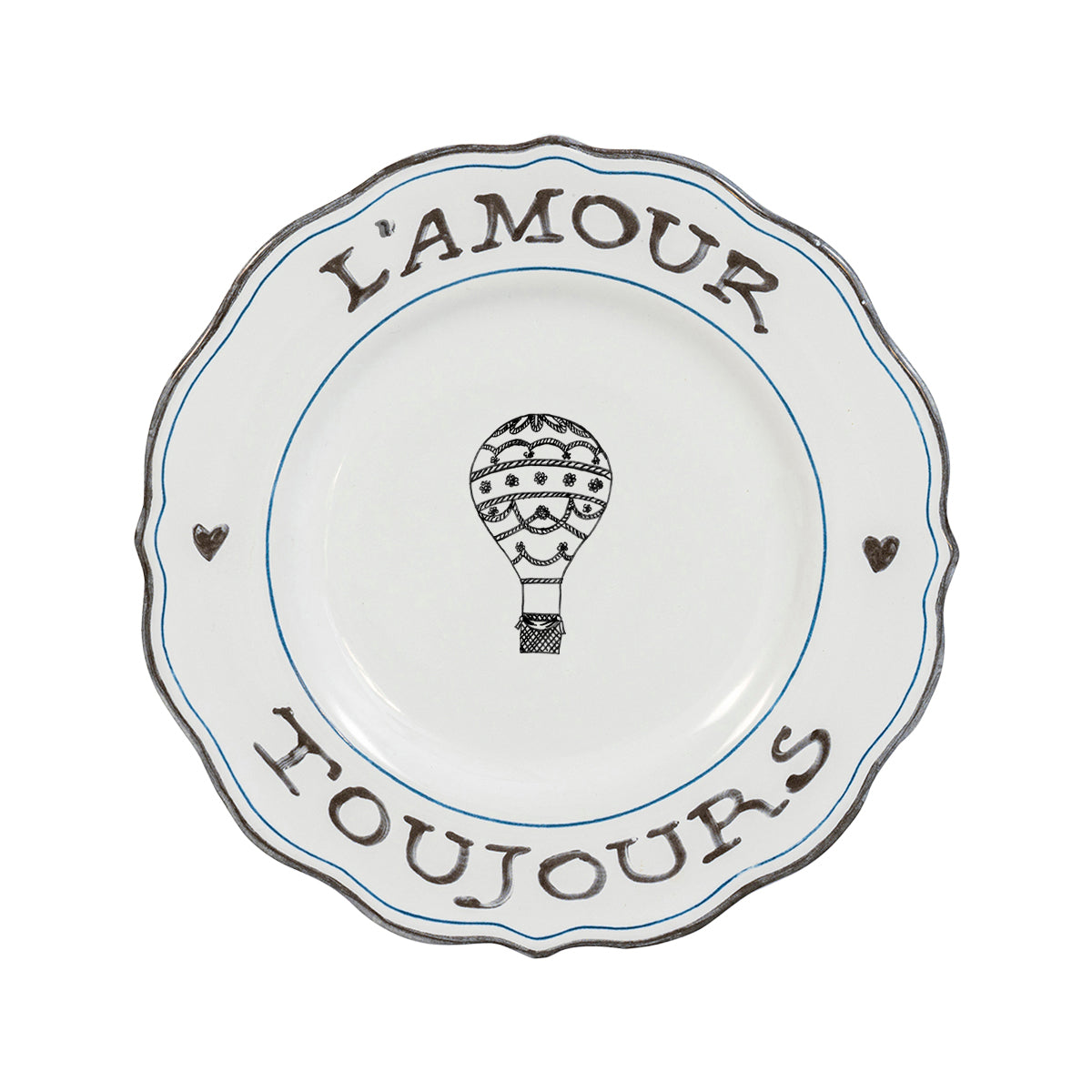 A bold declaration of L’amour Toujours (Love Forever) is hand sketched around the scalloped rim of this unabashedly romantic dessert/salad plate, making it a stunning silhouette for layering upon other dinnerware pieces. A pair of hearts and a hot air balloon remind us to share love wherever our entertaining adventures may take us, from a slice of homemade tarte tatin with coffee for a scrumptious breakfast in the garden, to a petite salad verte served under the stars for a moonlit dinner party. Packaged in our signature Juliska gift box, this set of four makes a charming present for any entertaining enthusiast.