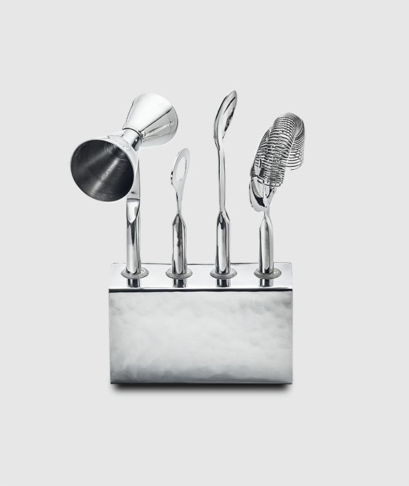 Tipton Bar Tool Set holds the vital bar tools of the mixologist’s art—bottle opener, jigger in two sizes, long spoon, and classic spring coil strainer. Handcrafted with our signature quality standards for you.