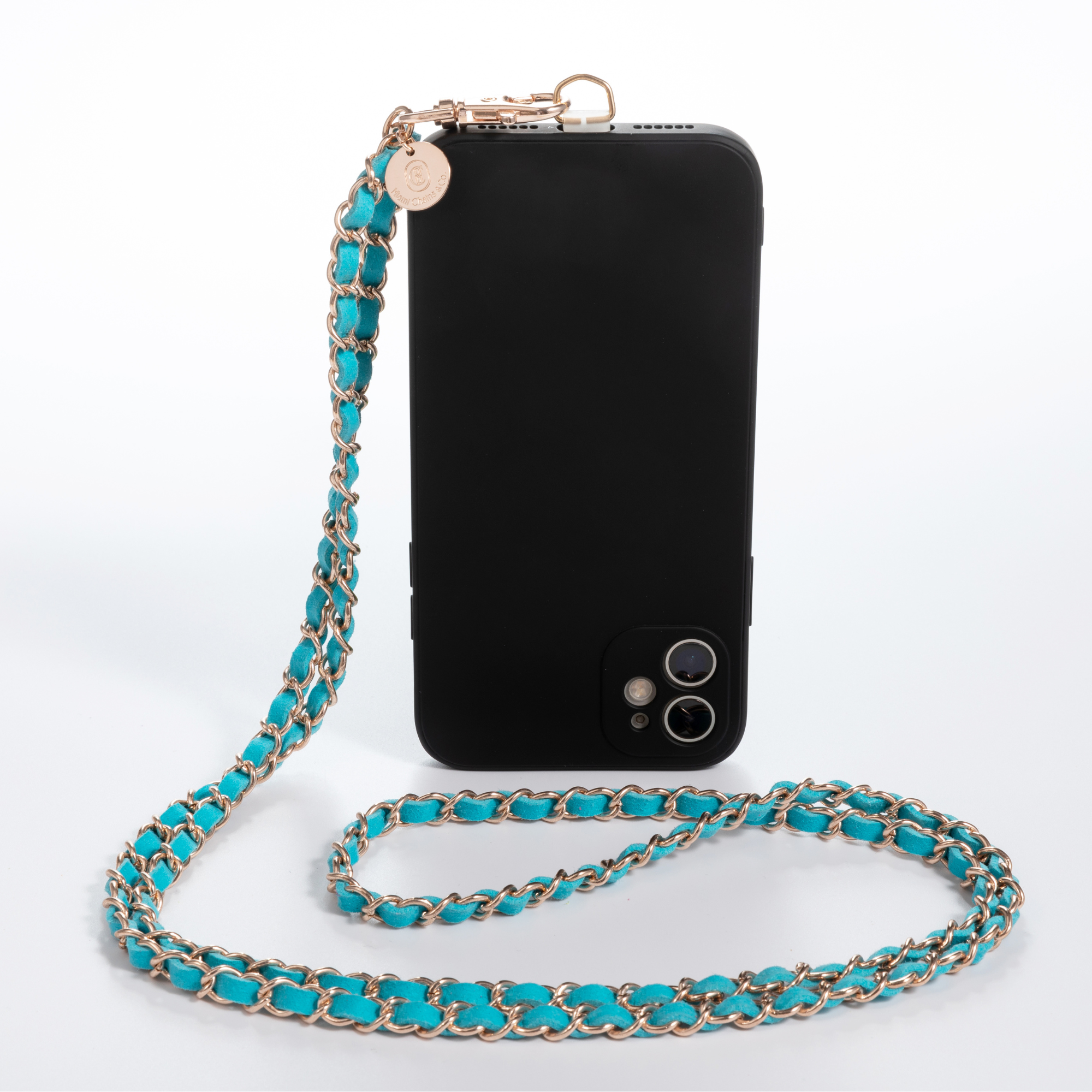 Rose Gold Plated Crossbody Phone Chain with 100% Azure Blue Suede Woven Throughout. With Phone Chains this chic, there has never been a more convenient, lightweight, and fashionable way to keep your phone with you; hands-free.