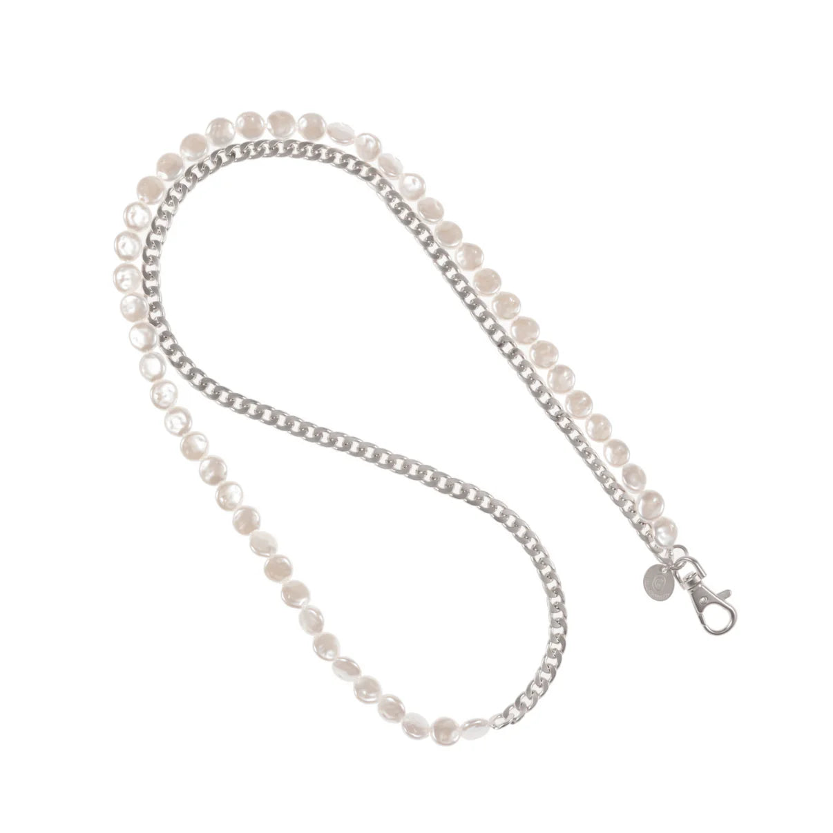 Half Pearl Half Silver Plated Cuban Link Chain. With Phone Chains this chic, there has never been a more convenient, lightweight, and fashionable way to keep your phone with you; hands-free.