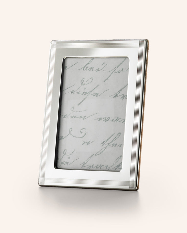 Our Silver Frame Collection is designed to help you tell your story and be a part of your home for years to come. Made in Florence, Italy, this sterling silver frame features a crosshatch pinstripe pattern and is finished with a tan velvet back that follows our 360 degree rule - both front and back must be exquisite in every detail so they look perfect from any angle.