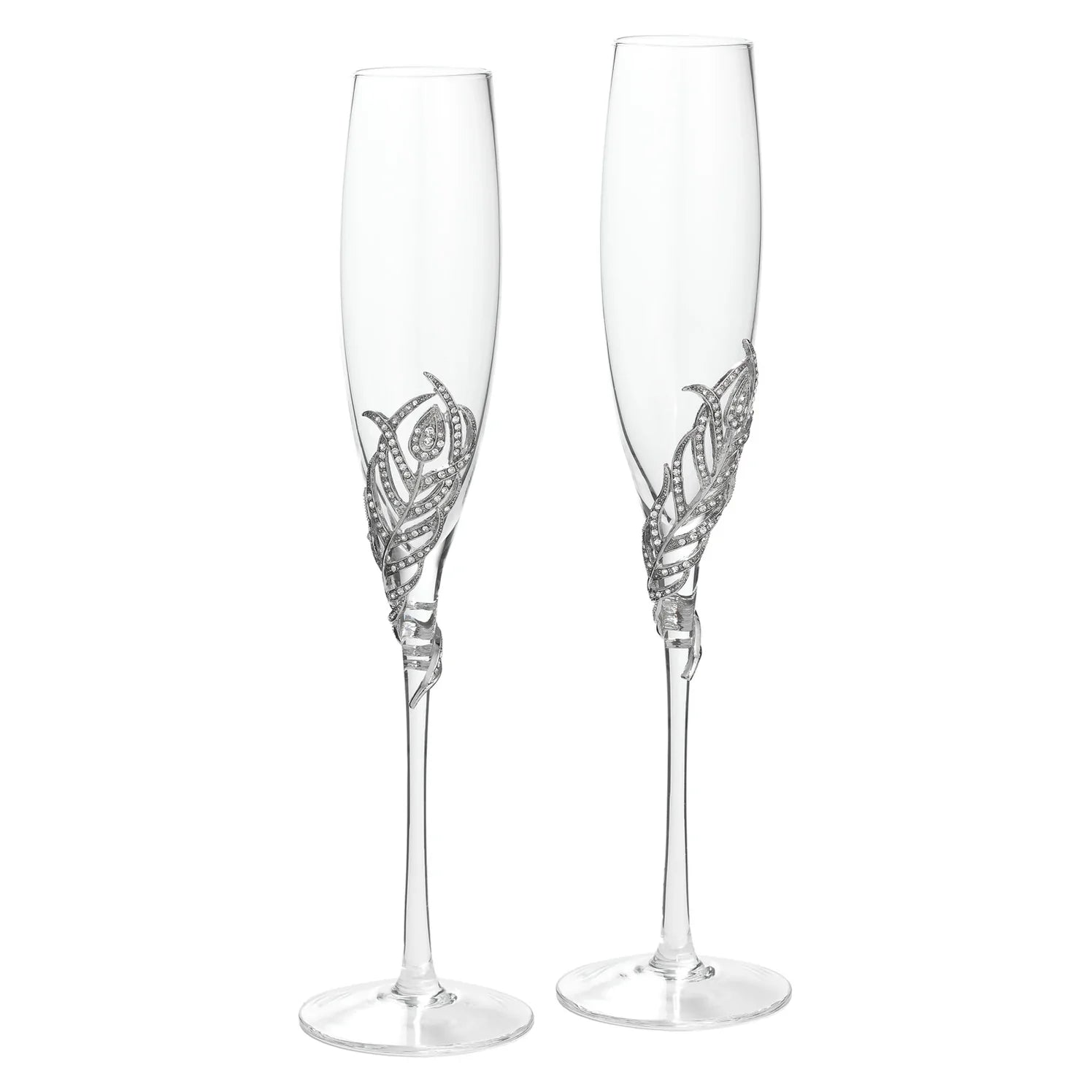 Glass stems, embellished with flowing silver finished pewter peacock feathers, encrusted with hand-set clear European crystals. Tarnish resistant. Hand-wash. Signature luxury gift box included.