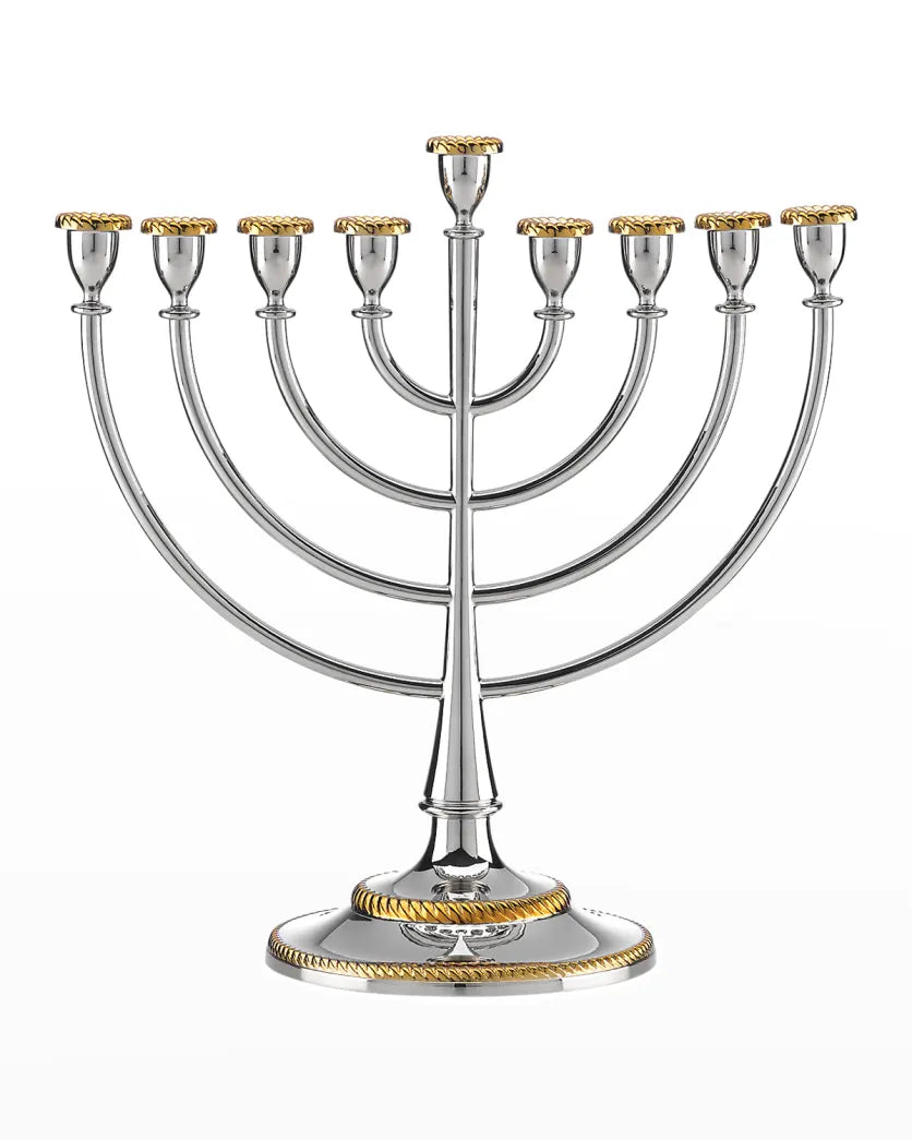 The Roseland Menorah features golden braid accents on a brilliant, nickel-plated finish. The menorah's luxurious presentation is perfect for celebrating the festival of lights. This heirloom quality piece makes an excellent gift that can be given all year round. Part of the Roseland Collection.