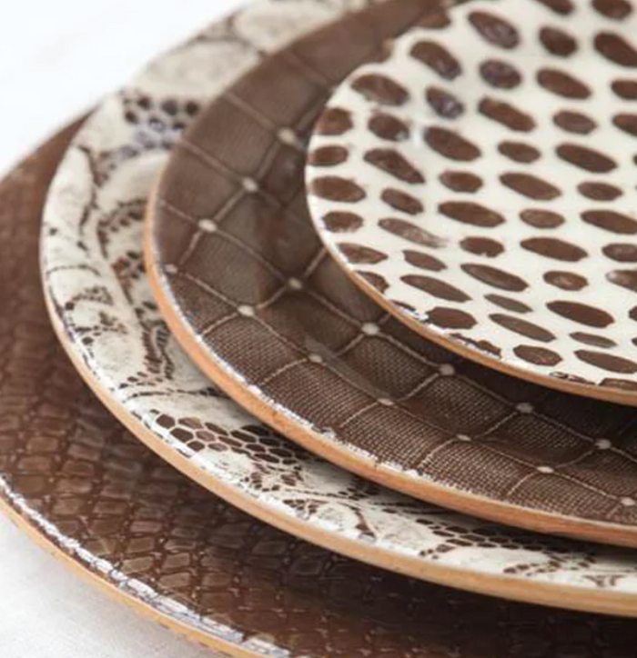 Patterns are created by painting through textiles and lace using liquid porcelain to produce a distinctive "one of a kind" result.