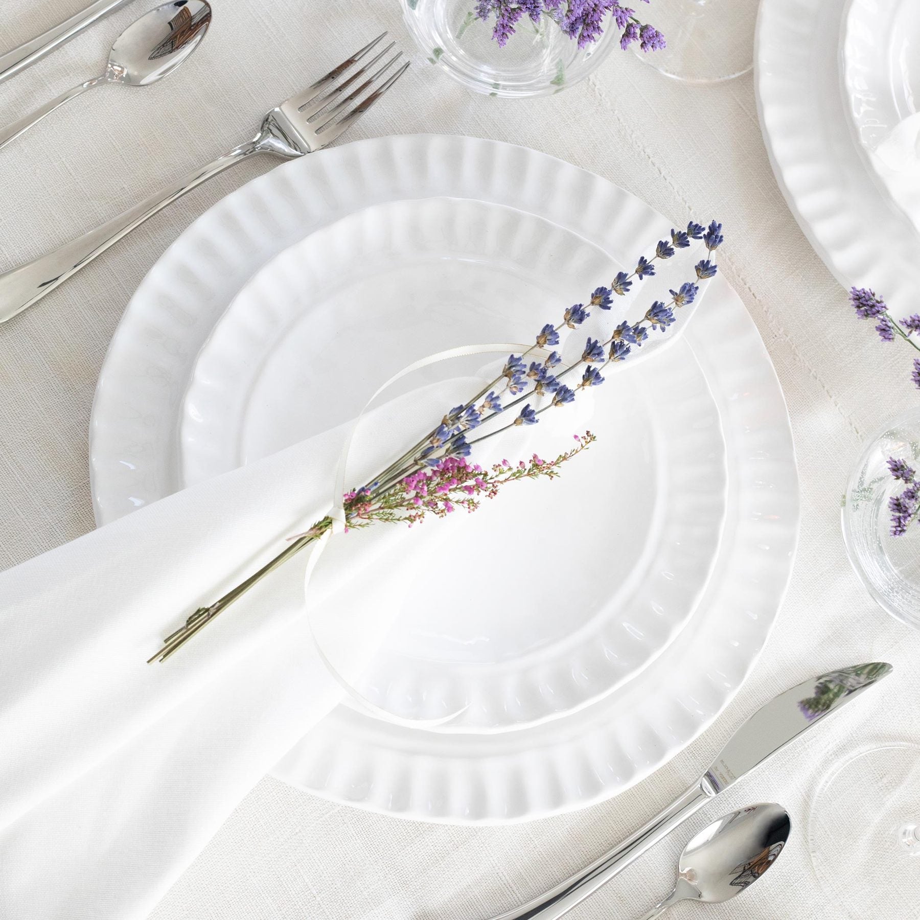 Pietra Serena, meaning serene stone, represents the simplistic beauty of the handpressed design found on the Pietra Serena Salad Plate.